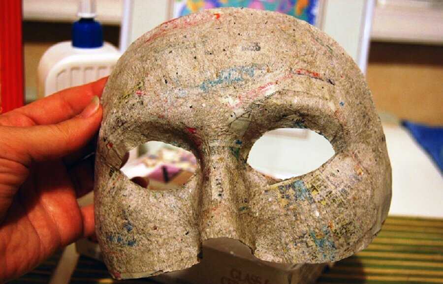 1. Нанести массу на форму для маски, затем облепить её бумажными полосками. Дать высохнуть.