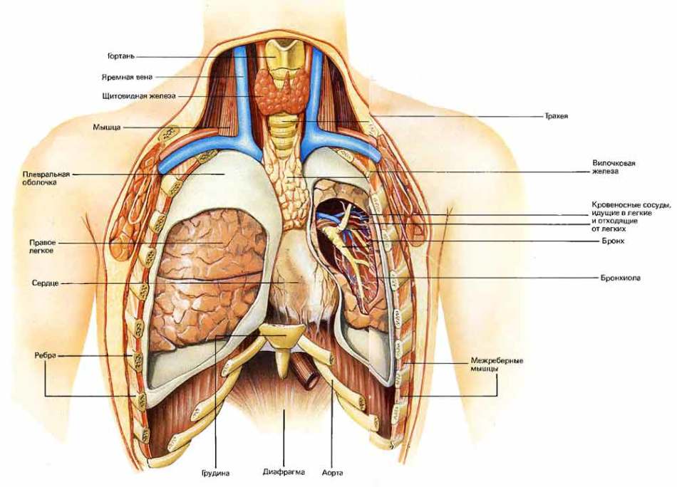Грудная клетка — сложная структура, в основном заполненная легкими. В ней находится самый важный мышечный орган — сердце и крупные кровеносные сосуды. Диафрагма — широкая плоская мышца, которая отделяет грудную клетку от брюшной полости.