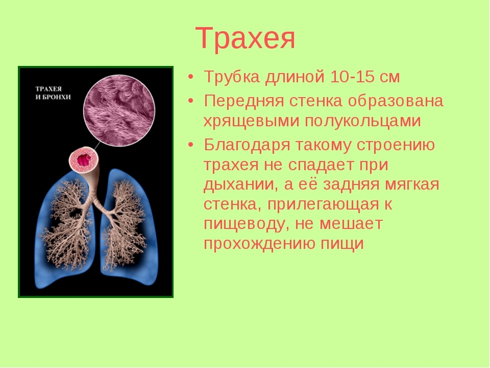 Трахея — занимает положение между бронхами и гортанью. Трахея — это хрящевые полукольца и соединительные связки, а так же мышечная ткань на задней стенке, покрытая слизью. К низу, трахея делится на два бронха. Эти бронхи направляются в левое и правое легкое. По сути бронх — самое обычное продолжение трахеи. Легкое внутри состоит из множества разветвлений бронх. Функции бронхов: