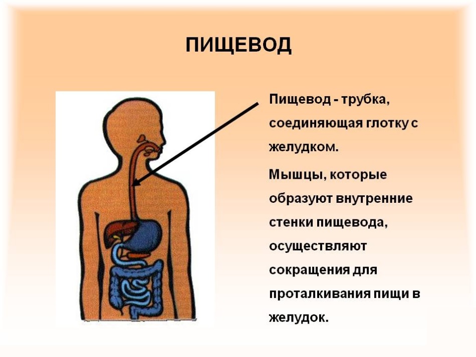 Пищевод — длинный орган, который берет свое начало еще в гортани и проходит сквозь диафрагму (мышечный орган), соединяясь с желудком. Пищевод имеет кольцевые мышцы, которые обеспечивают передвижение пищи к желудку.