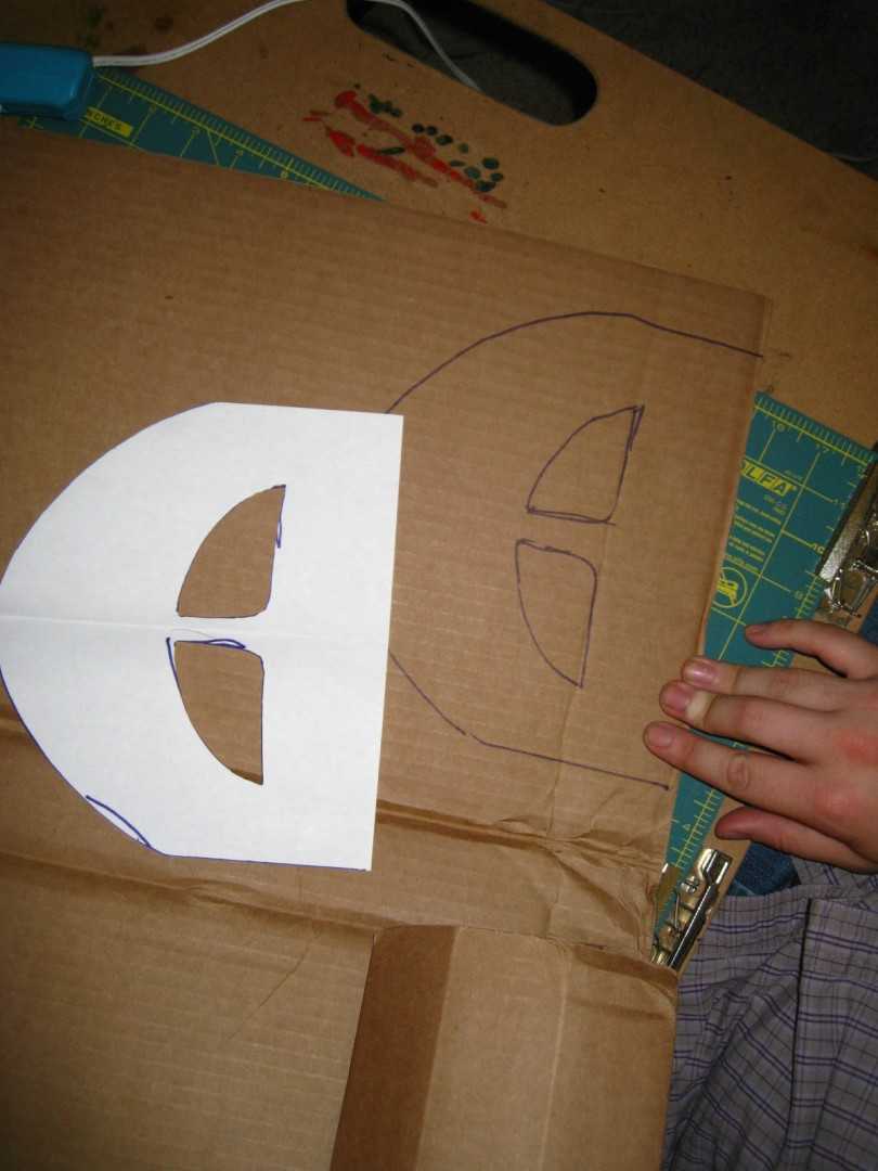 - Как только это произошло, необходимо аккуратно вырезать в будущем шлеме два отверстия. Первое будет необходимо, чтобы ребенок мог просунуть через него голову. Второе для лица.