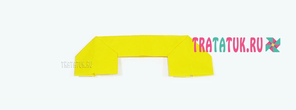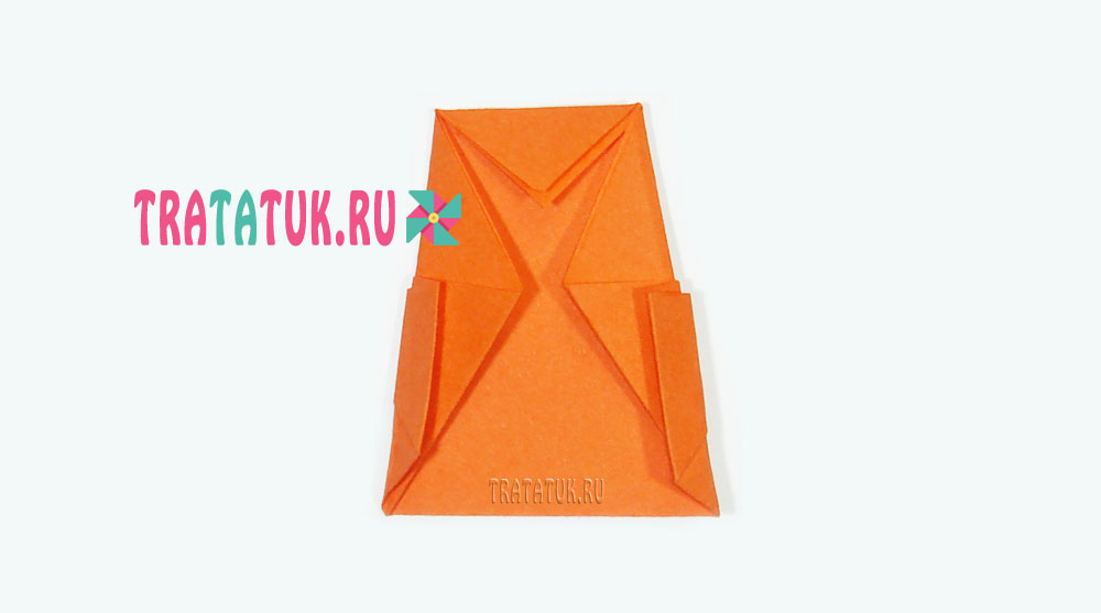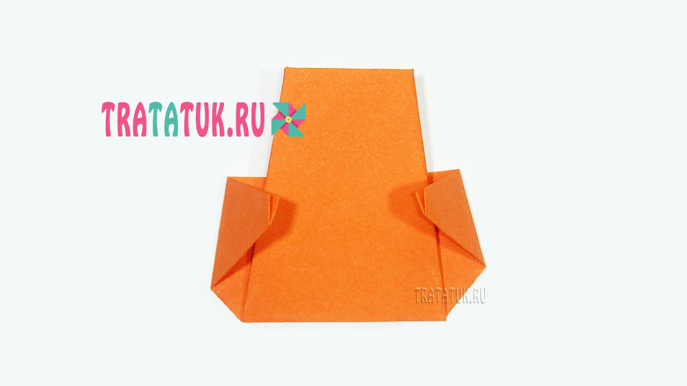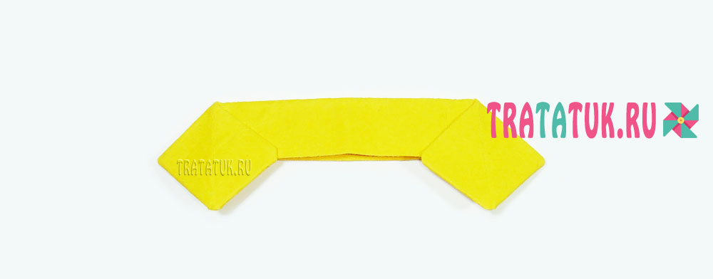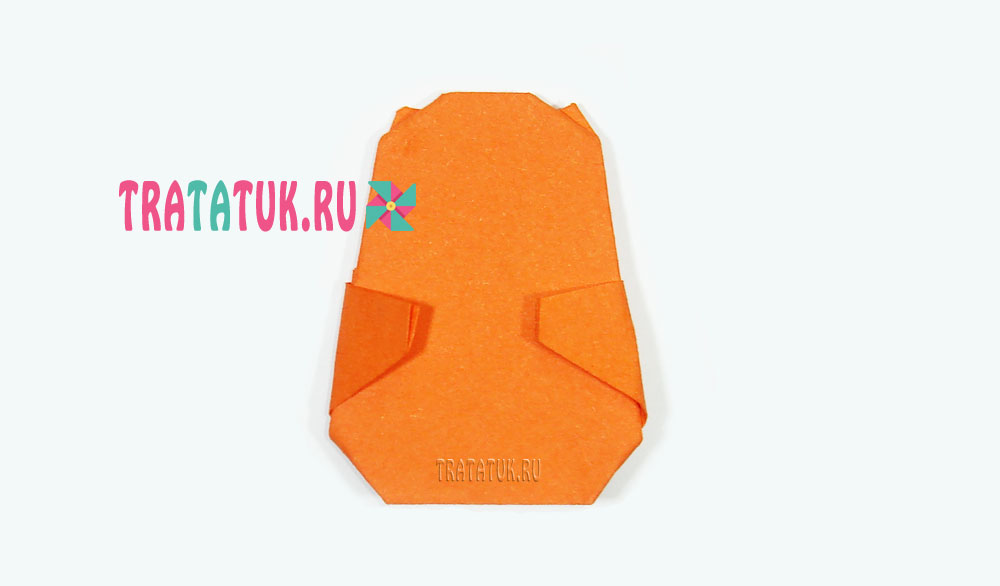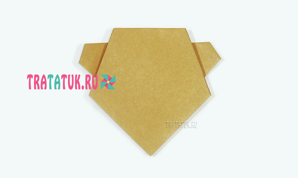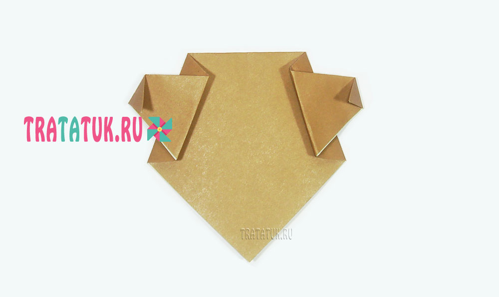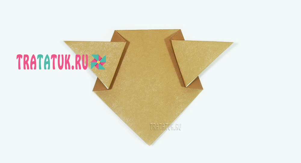 Переверните деталь на другую сторону. Расправленные уголки по сторонам, загните наперед, соединив кончики.