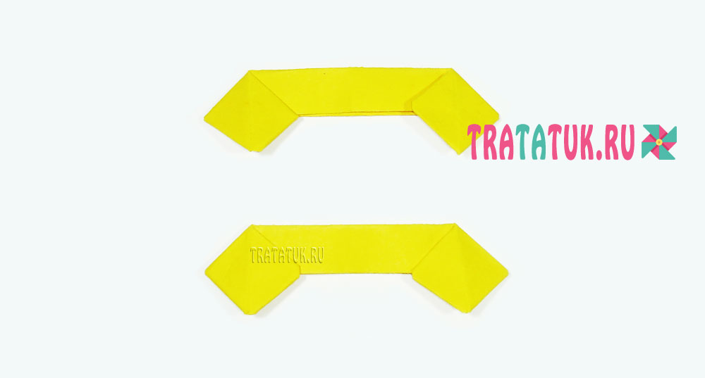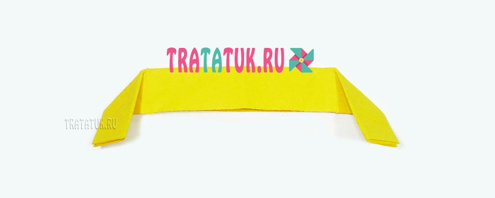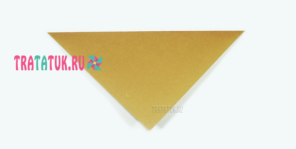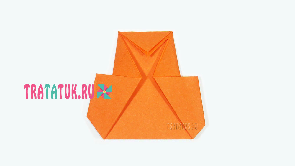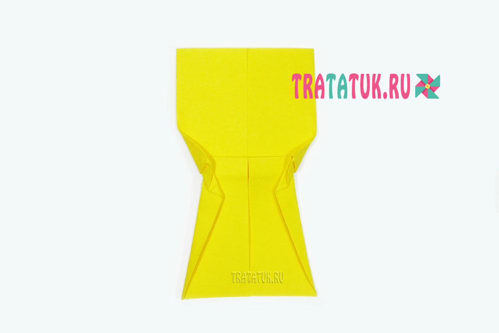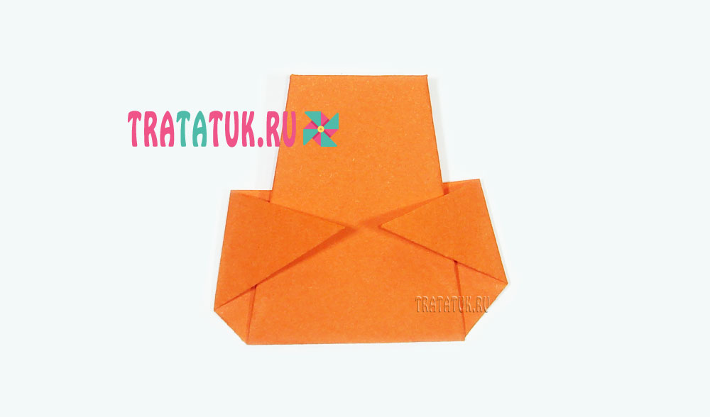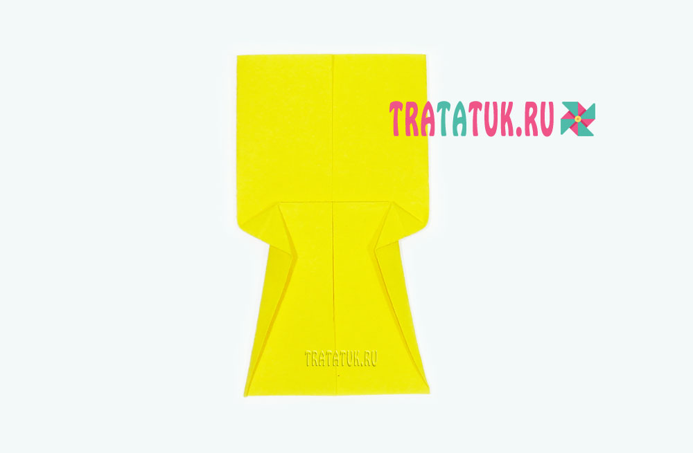 Переверните деталь на другую сторону. Расправленные уголки по сторонам, загните наперед, соединив кончики.
