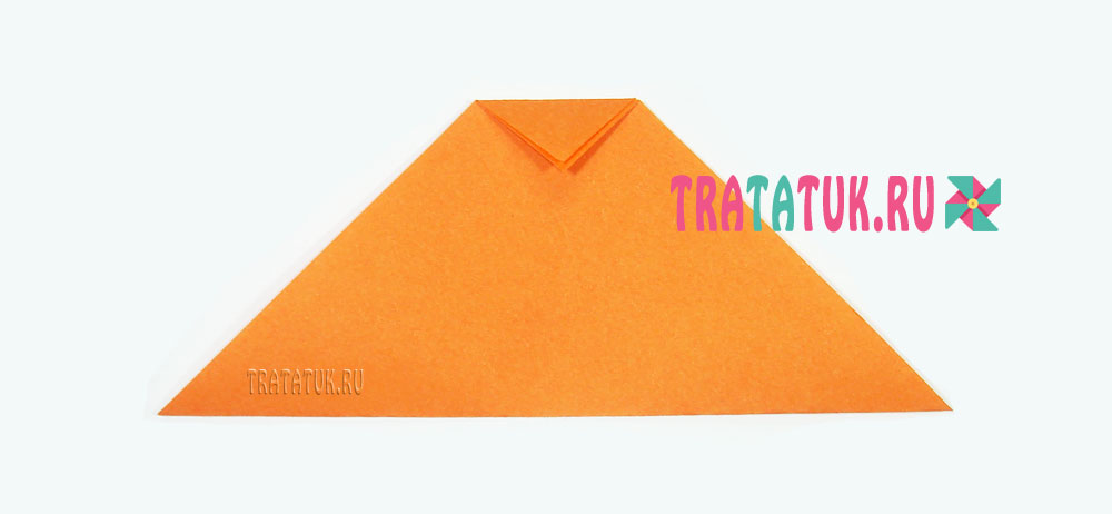 Два угла с обеих сторон треугольника загните внутрь, чтобы они немного пересеклись. Сгиб должен проходить, начиная от краев маленького верхнего треугольничка, по его бокам.