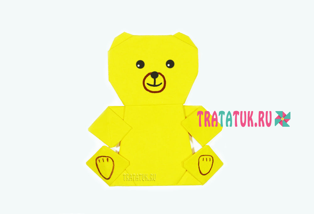 Нарисуйте мордочку, лапы. Оригами мишка готов.