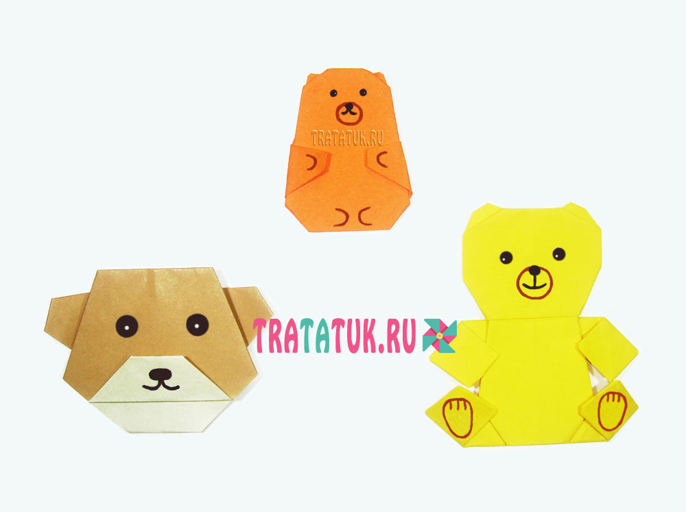 Вот в таких трех вариантах может быть оригами медведь, выбирайте понравившийся и по силам. Все они не сложные, главное – следовать поэтапному инструктажу и наглядным фото.