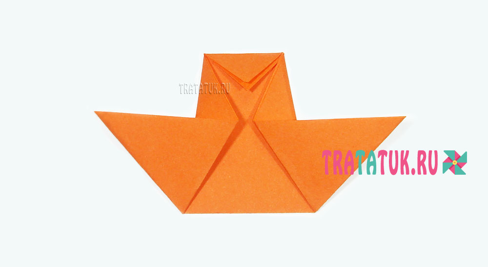 - Переверните оригами и поднимите вверх маленькие образовавшиеся прямоугольники, загибая крайние уголки.