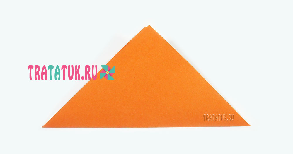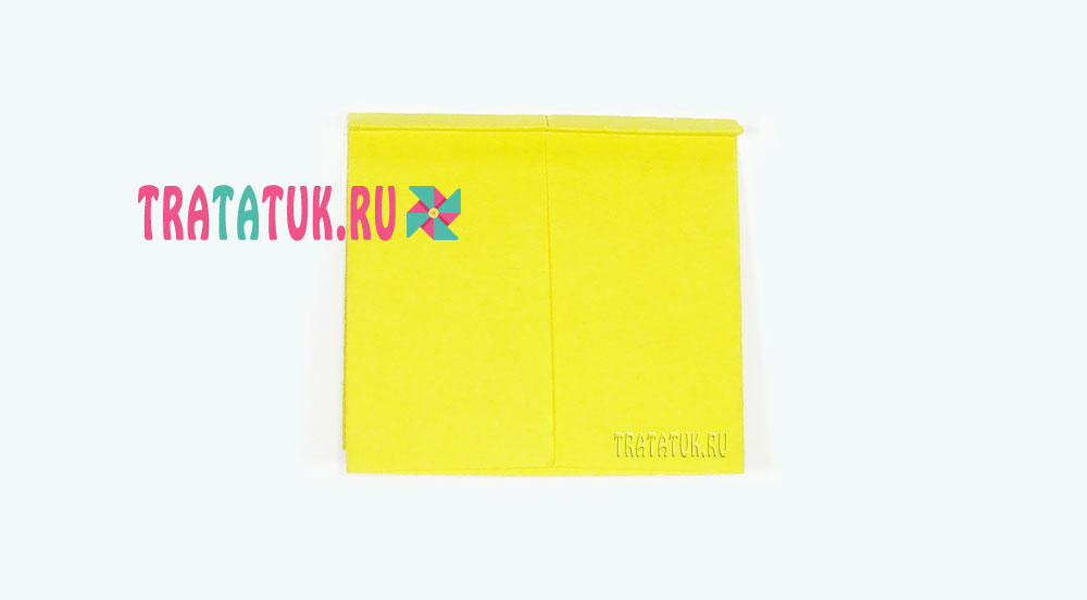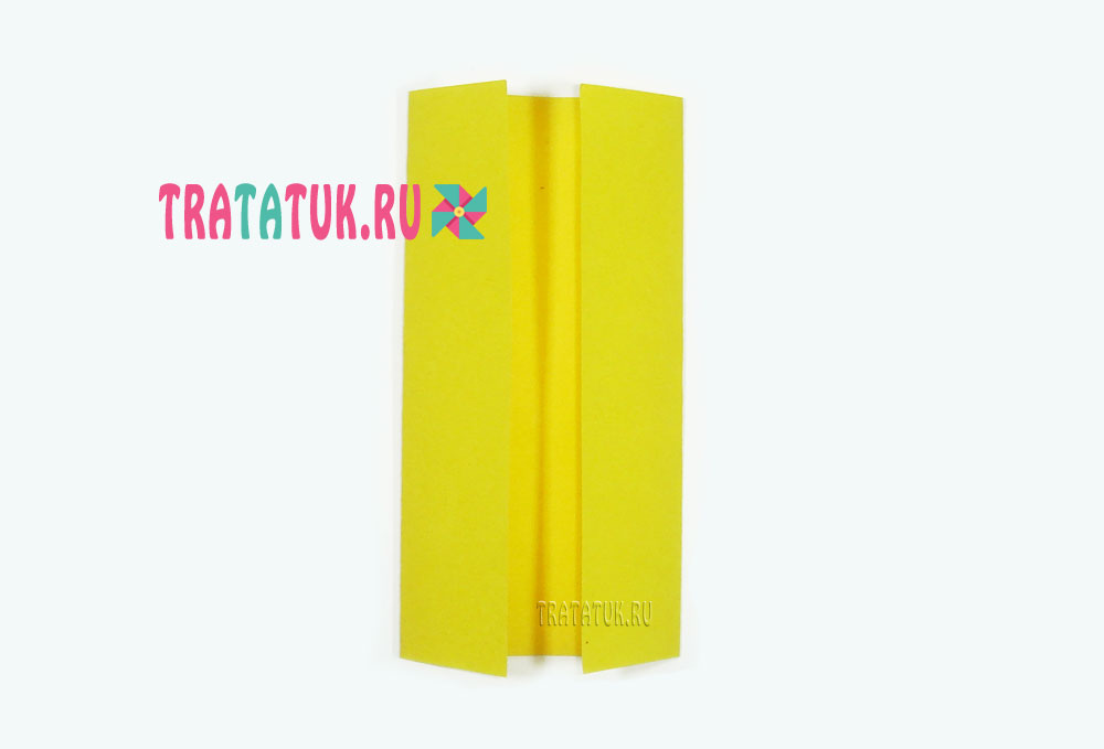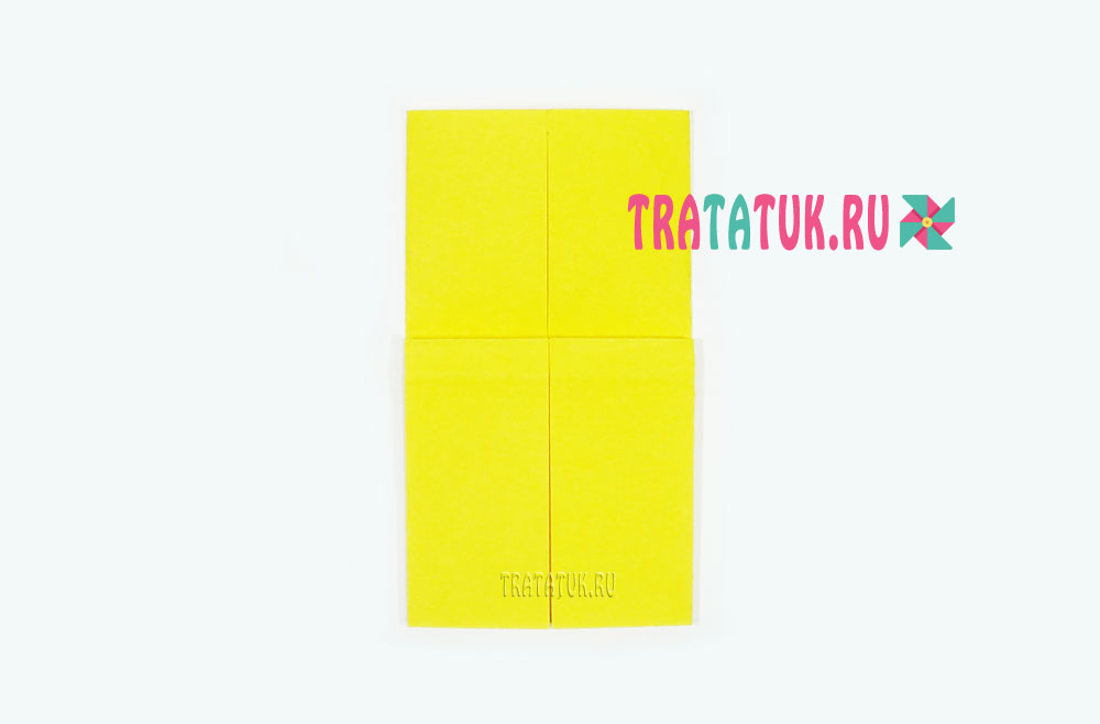 Раскройте сложенную бумагу, потянув за нижнюю часть. Складочку при этом не распрямляйте. Она должна быть в центре прямоугольника. Благодаря ей деталь разделяется на две части – туловище и голову.