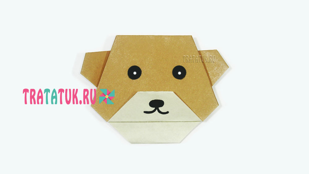 Уголки на светлой части загните так, чтобы они были параллельно друг к другу. Нарисуйте глаза, носик с улыбкой. Голова медведя в технике оригами готова.