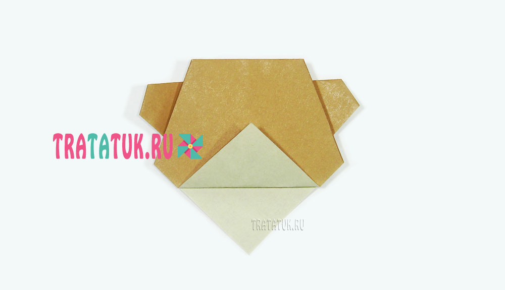 Одну часть нижнего уголка направьте вверх. Появится светлая часть бумаги, которая будет разграничивать мордочку мишки.