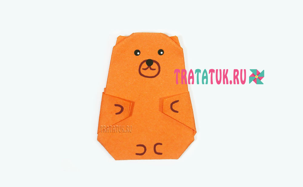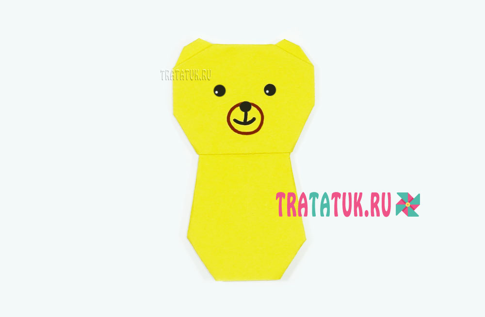Нарисуйте мордочку, туловище оригами медведя готово.