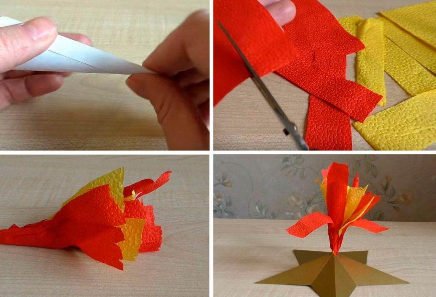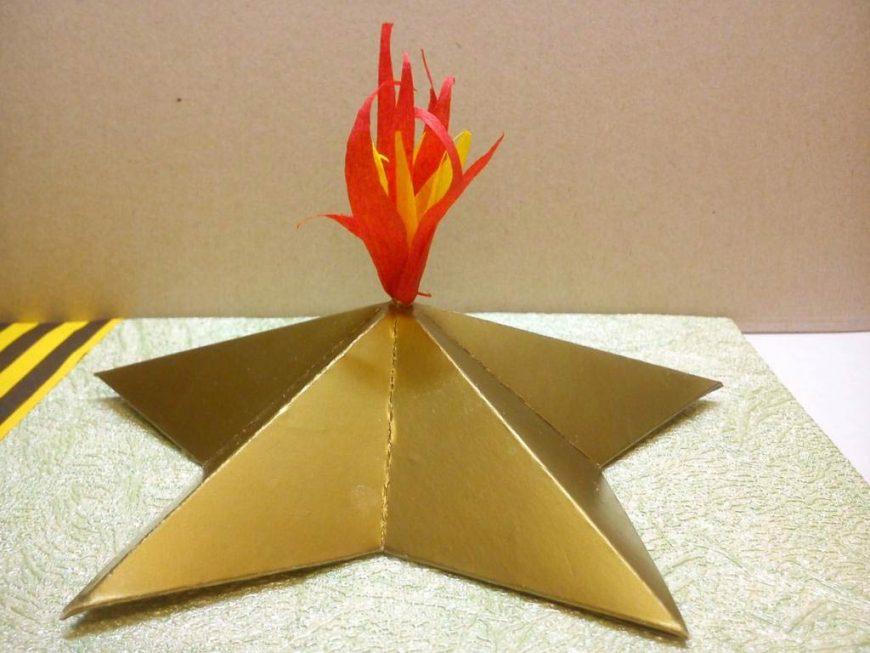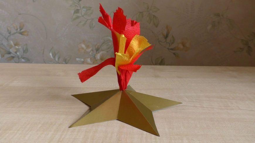 Вечный огонь – очень символичная поделка, которую обязательно оценят по достоинству взрослые. Причем этим изделием могут смело заняться девочки. На изготовление вечного огня уходит немного сил, времени и расходных материалов: