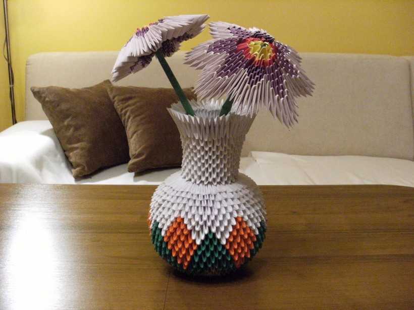Ваза в технике оригами является одной из самых простых фигур. Для её создания понадобится подготовить схему или фото макета, изготовить необходимое количество модулей из красивой бумаги.