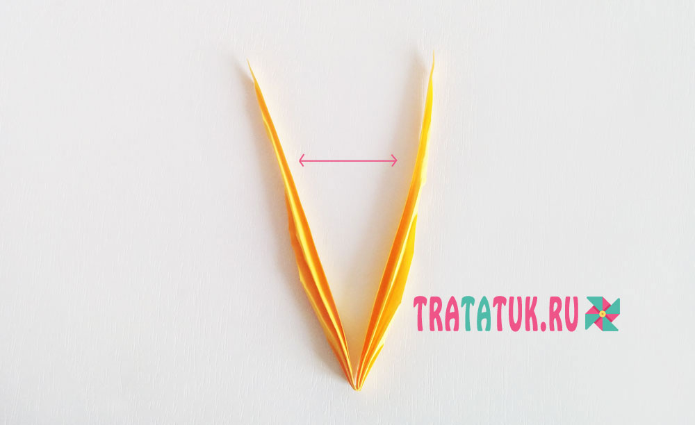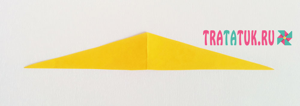 - Затем каждый разворачиваем (модуль перед нами расположен так, что сгиб лежит вертикально) и правый и левый уголок приводим к сгибу, как показано на следующем фото.