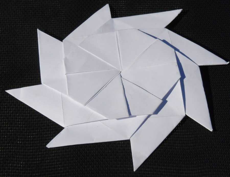 Тем, кто освоит технику построения сюрикена для новичков — откроются новые возможности воплощения смелых творческих идей. Возможность комбинирования шаблонов позволяет делать двойные и восьмиконечные звезды японских ниндзя. На фото рис. 1 – 2 показаны примеры сложных композиций, построенных из необходимого количества метательных, боевых дисков из бумаги.
