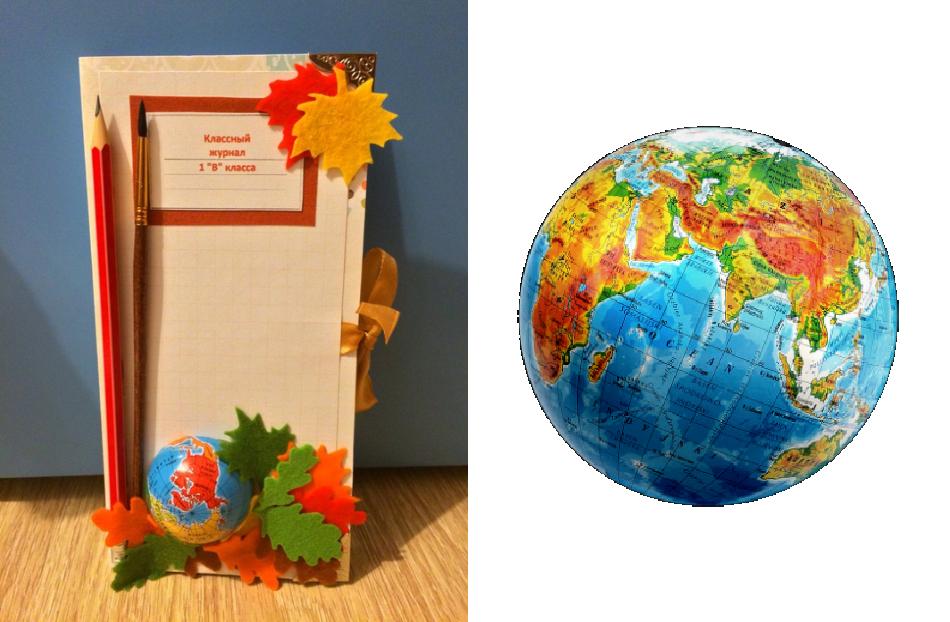 6. Украшаем открытку вырезанным изображением глобуса, подготовленными листиками, простым карандашом и кисточкой. Последние два предмета опытные рукодельницы рекомендуют прикрепить на клей «Момент». Младшекласснику этот этап инструкции «Как сделать учительнице открытку» рекомендуется выполнять вместе с родителями.