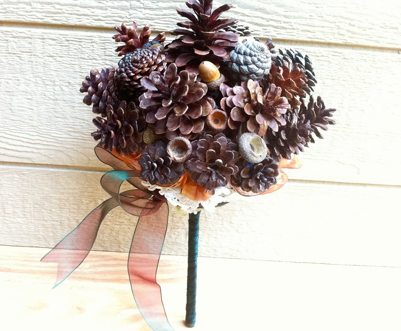 На концах проволоки прикрепляйте шишки или бусины с помощью клея. Можно их окрасить или присыпать блестками. Отдельные длинные палки или ветки соединяйте в букет и перевязывайте лентой. Образовавшуюся пустоту заполняйте атласными бантами и желудями. Можно поставить этот замечательный букет в вазу или подарить близким.
