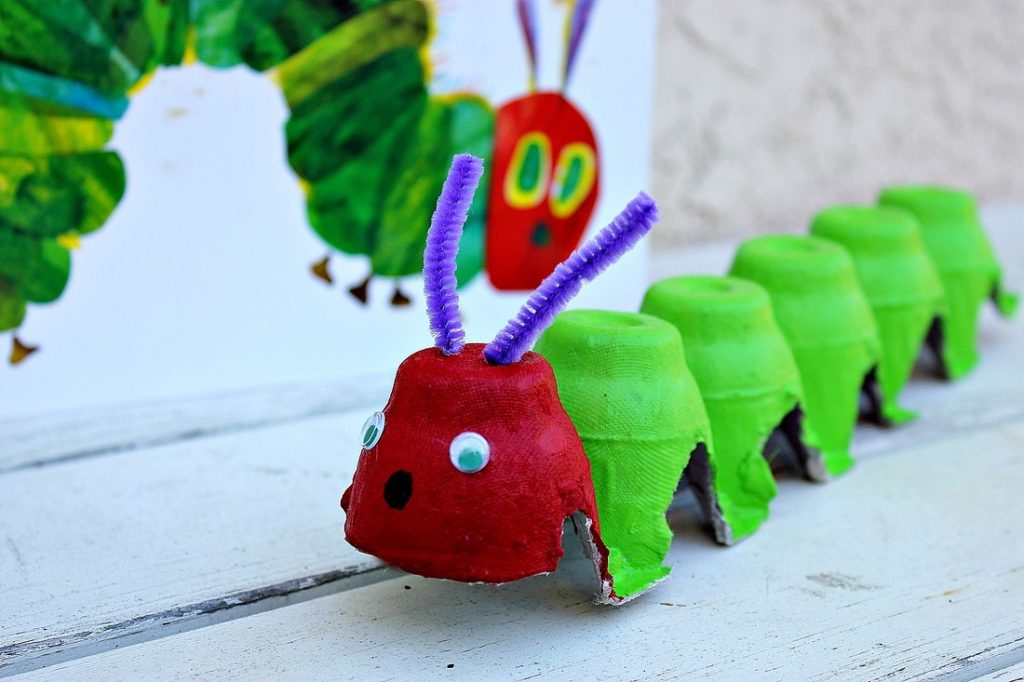 Один ряд картонной упаковки отрезают вдоль – это будет тело гусеницы. Его разукрашивают одним цветом, а голову – другим. Включив фантазию, можно дорисовать гусенице глазки, рот и носик. Небольшую трубочку от коктейля (рожки) нужно разрезать пополам и воткнуть в голову. Такая игрушка будет особенно уместной после прочтения книги «Очень голодная гусеница» Эрика Карла.
