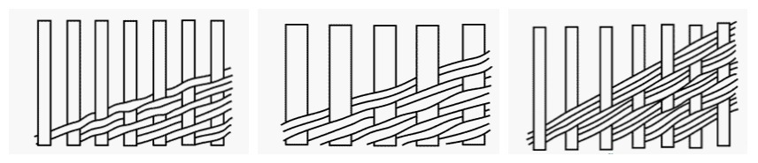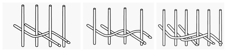 Простое плетение с наклоном – выполняется по принципу вышеописанного, но имеет определенный наклон. Можно огибать стойки как одной газетной трубкой, так и несколькими (до 4).