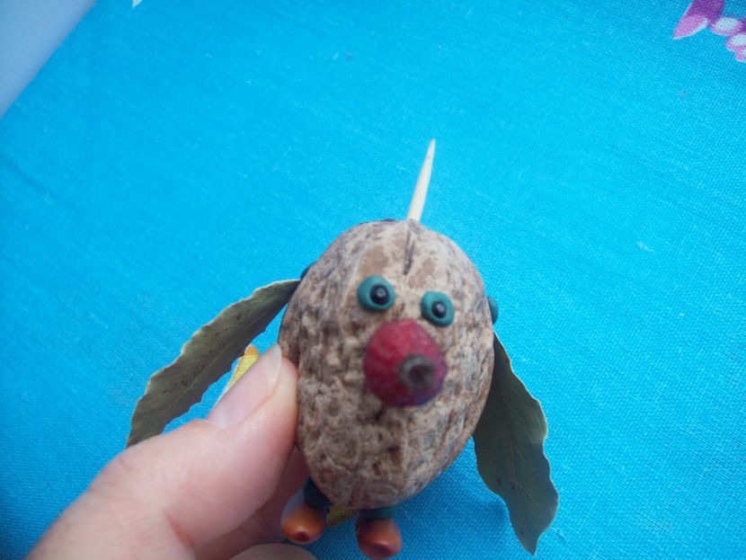 Для начала красим в цвет будущей птицы. Орех послужит телом. После чего из пластилина лепим ноги. Для большей устойчивости лучше лепить ноги по форме ног пингвина. Далее крепим сзади кусочек пластилина, куда вставляем перья. Либо перья можно просто приклеить к скорлупе. Остается дело за малым. Лепим клюв и приклеиваем бусинки, служащие глазами. Если еще остались перья, можно добавить хохолок.