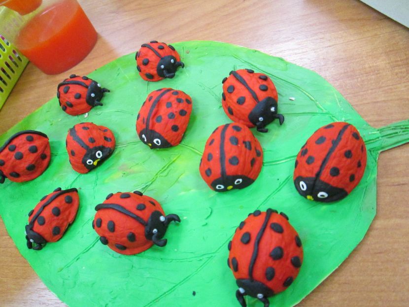 Ореховая скорлупа прекрасно сочетается со многими материалами, но лучше всего ей подходит пластилин. Элегантными получаются поделки картин, различных насекомых из скорлупы грецкого ореха и пластилина. Рассмотрим несколько возможных вариантов.