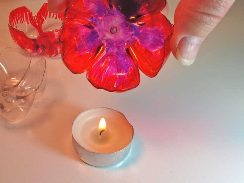 Для того, чтобы отрезанный пластик не был острым, края формочек несколько секунд подпаливают разогретым в металлической чаше песком — это также можно выполнить по желанию. Затем в заготовках шилом проделывают отверстия и нанизывают на прочную леску.