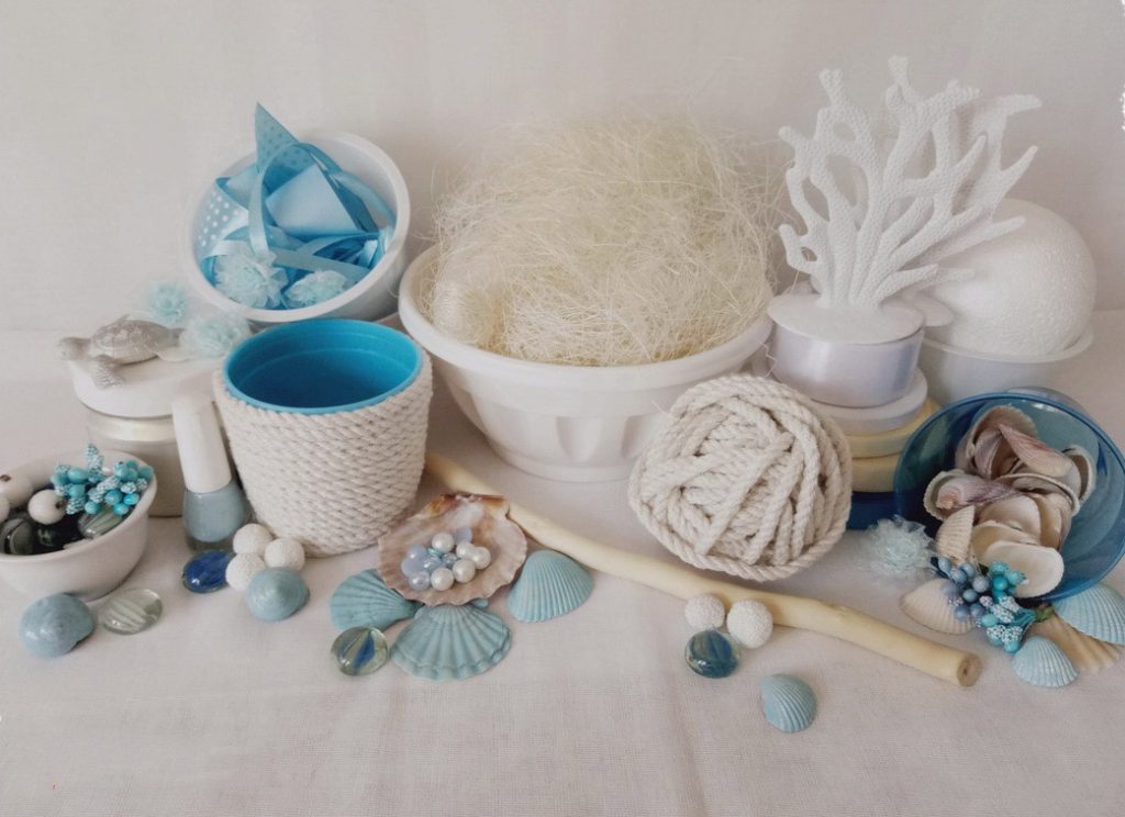 Подчеркнуть морской характер украшения можно тонкой веревкой: достаточно приклеить по краю вазы несколько рядов льняного жгута, имитирующего канат.