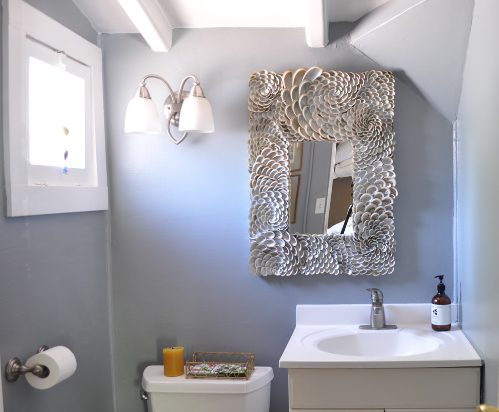 - Гвоздем и молотком – оклеиваем раковину скотчем (бумажным малярным), на вдавленной стороне рисуем метку, приставляем острием гвоздь и несколько раз слегка ударяем молотком по шляпке, чтобы наметить отверстие. Далее постепенно расширяем его тем же гвоздем или шилом до нужного диаметра.