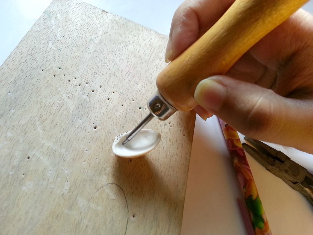 Для изготовления бижутерии потребуется сделать в ракушке одно или два отверстия. Этот этап может напугать начинающих мастериц, но ничего сложного здесь нет. Главное – это подобрать тоненькое сверло диаметром не более 2-3 мм. Достаточно заклеить место скотчем, прижать раковину к деревянному бруску и просверлить дырочку.