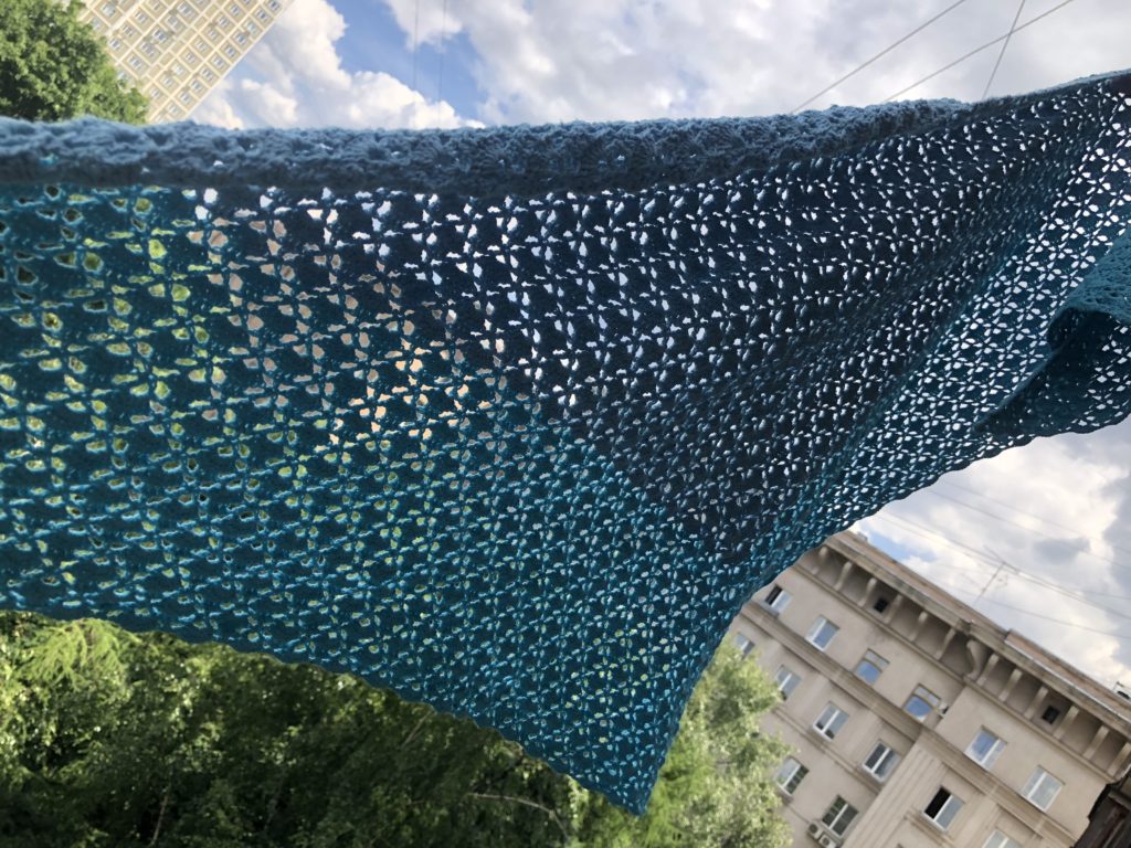 Так чередовать несколько рядов (по желанию) глади и ряды с дырочками. На желаемой ширине шали нужно провязать перед закрытием петель несколько рядов платочной вязки (только лицевыми петлями), при этом соблюдать все прибавки. Закрыть петли.