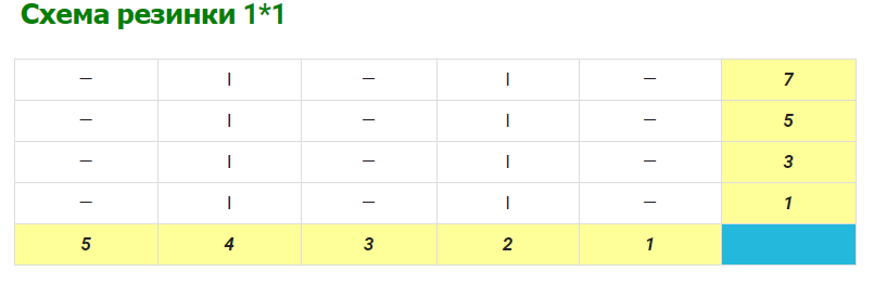 Все резинки отличаются друг от друга только последовательностью чередования разных видов петель. При вязании мастера чаще всего используют следующую схему: