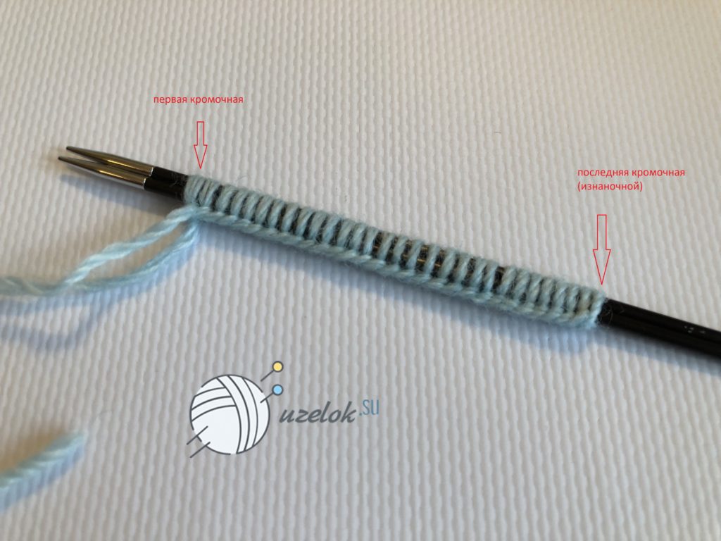 1)Необходимо набрать на спицы нужное количество петелек (оно должно быть четным) и еще две петли для кромки.