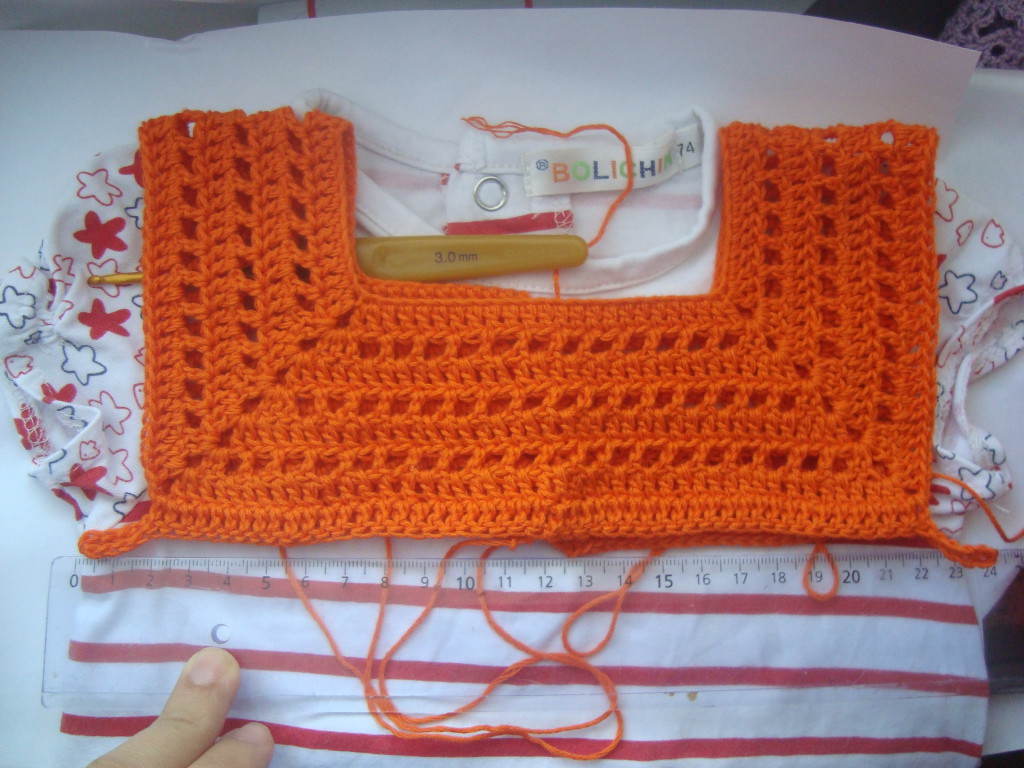 : Топик для девочки 1 год. Рассчитываю, сколько петель мне надо набрать подмышками для соединения переда и спинки. На фото видно, что один ряд даст нужную высоту проймы. В нем и надо будет соединить вязание.