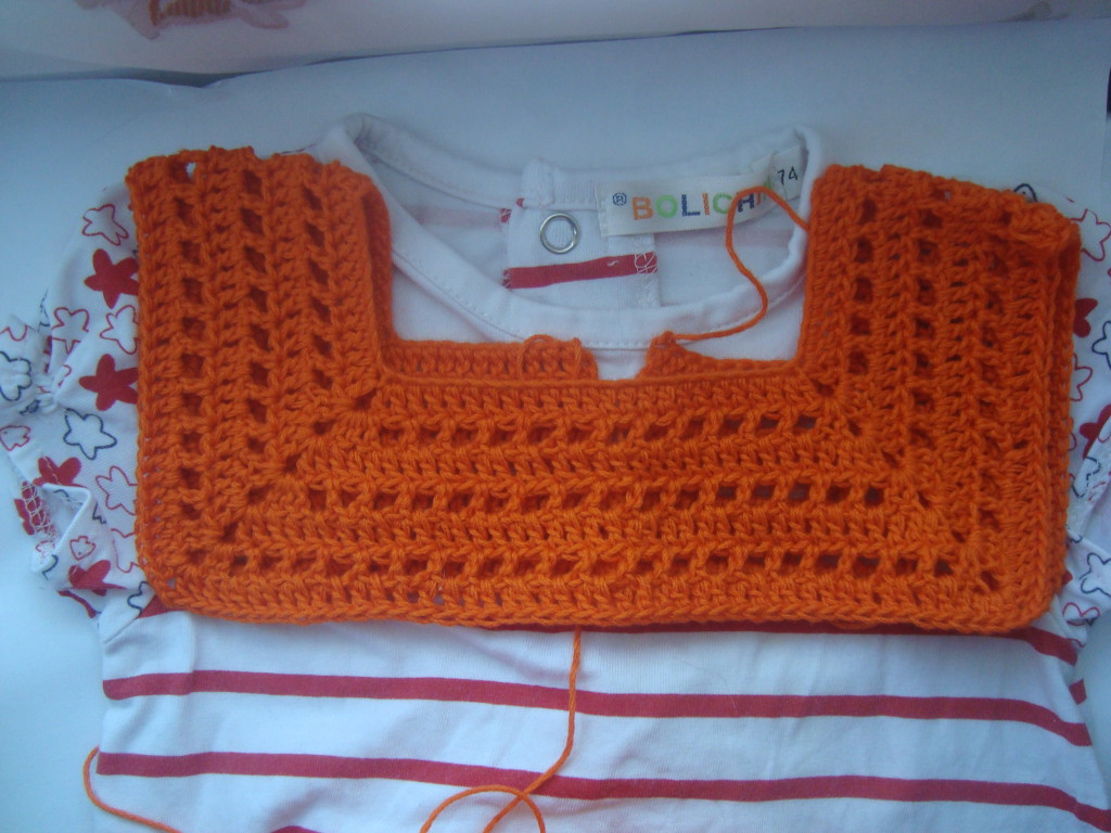 В этом случае, чтобы плечики не вышли слишком широкими, нить нужно оборвать, и провязать отдельно деталь спинки и деталь грудки. Спинку можно сделать на 3-5 см длиннее, чтобы получился так называемый росток
