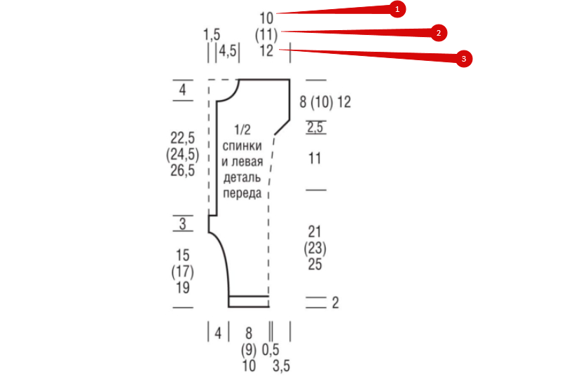 Теперь работу следует разделить, ориентируясь на ранее поставленную метку. Провязать первых: 1–31 петлю, 2–34 петли, 3–37 петель. Другой нитью вывязать спинку: 1–70 петель, 2–76 петель, 3–82 петли. Вторую полочку тоже вязать отдельно: 1–31 петля, 2–34 петли, 3–37 петель.