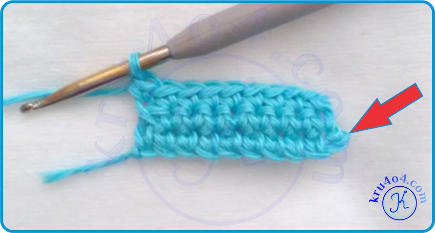 - крючок вводится под нитку горизонтальной перемычки, которая образовалась при правильном повороте вязания. И последняя петля в ряду провязывается за эту нитку.