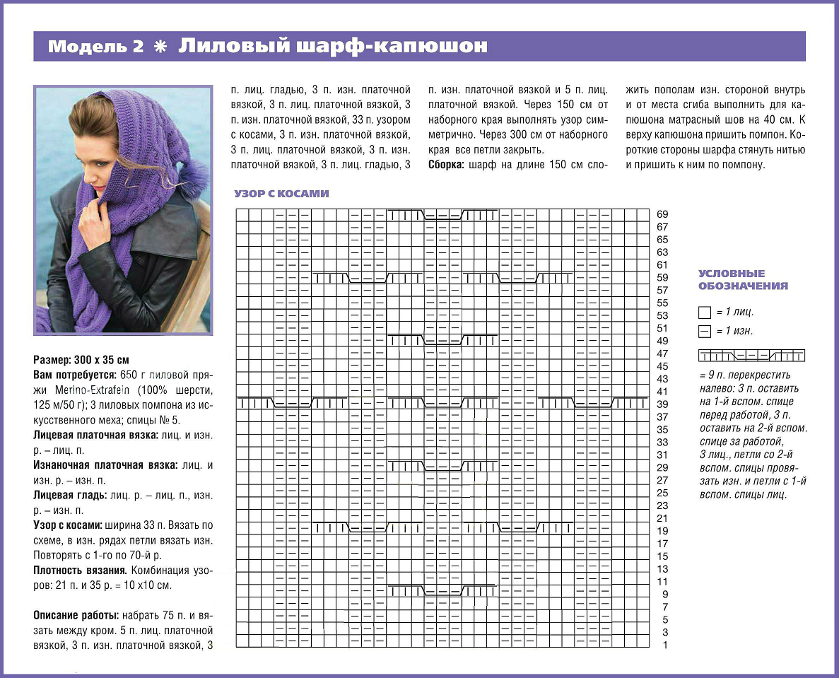 Рассчитывают размер, который требуется по образцу, связанному из выбранной пряжи Толщина и ширина чаще дается в описаниях. Ниже приведено описание, схема одного из современных шарфов-капюшонов.