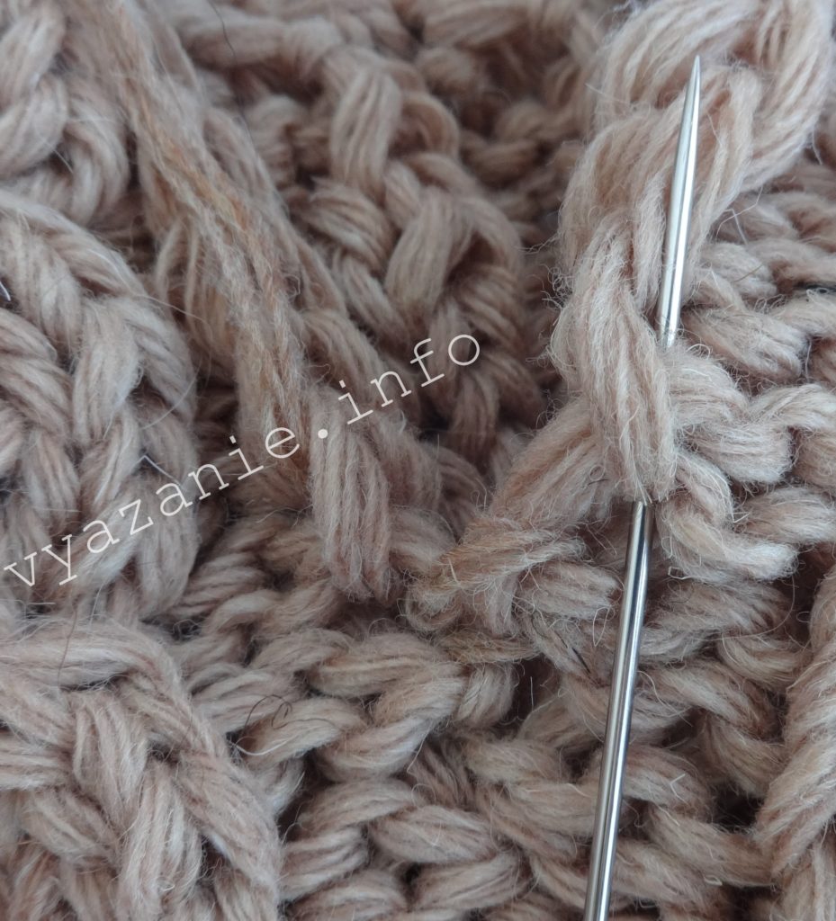 Используем пряжу, из которой связано основное полотно. Нить должна быть втрое длиннее предполагаемого шва.
