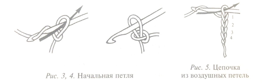 В полученную начальную петлю проденьте крючком, набросьте на него нить и протяните через петлю. Таким образом, выполняя все последующие петли, получают цепочку из воздушных петель — начальный ряд при вязании крючком, основание для вязания любого узора. В счет рядов при последующем вязании он не входит.