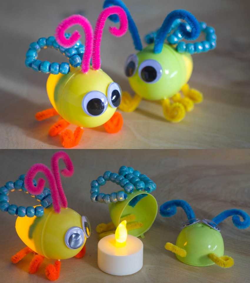 Усики светлячков делаем из «пушистой» проволоки. Если таковой нет, то оберните обычную проволоку цветными нитками. Приклеиваем или рисуем фломастерами глазки.