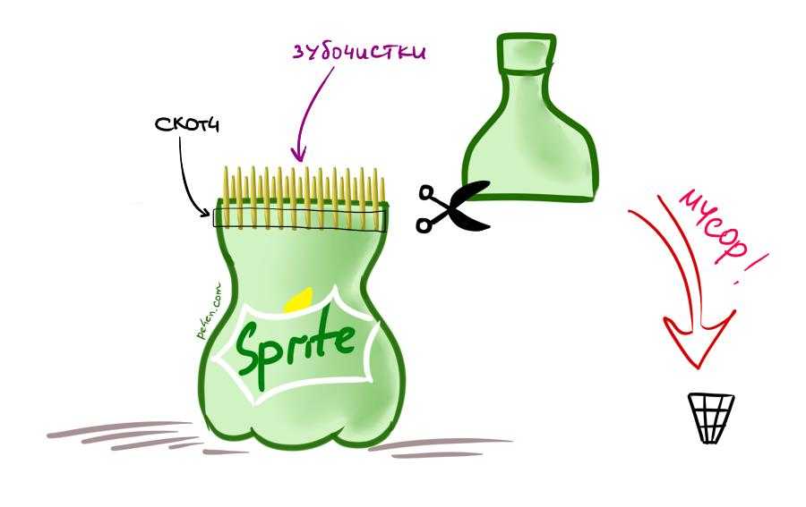 Если занятие и вязание на этом станке вас заинтересовало и не терпится начать работу, но самого приспособления у Вас еще нет, то его можно смастерить из подручных материалов. Например, из пластиковой бутылки и зубочисток или спичек:
