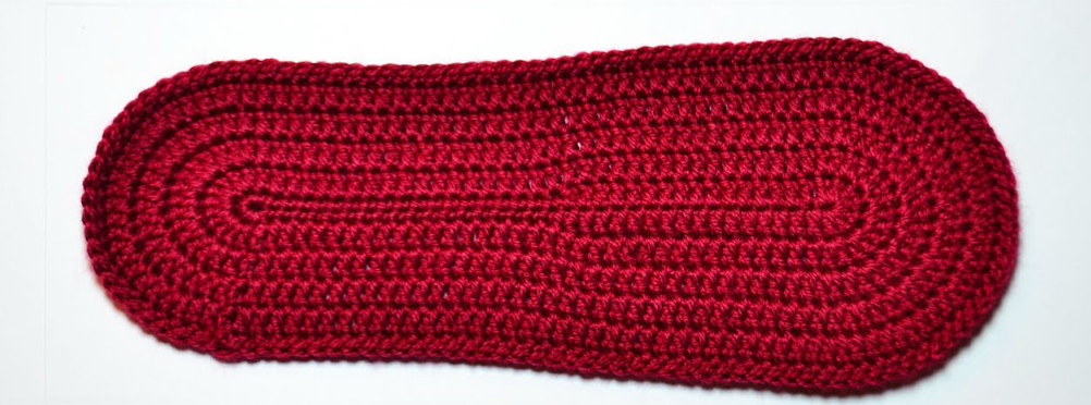 9. Закончить вязание мысочной части тапка ст. б/н, дойдя в конце ряда до подошвы, провязать ст. б/н. еще и по краю подошвы