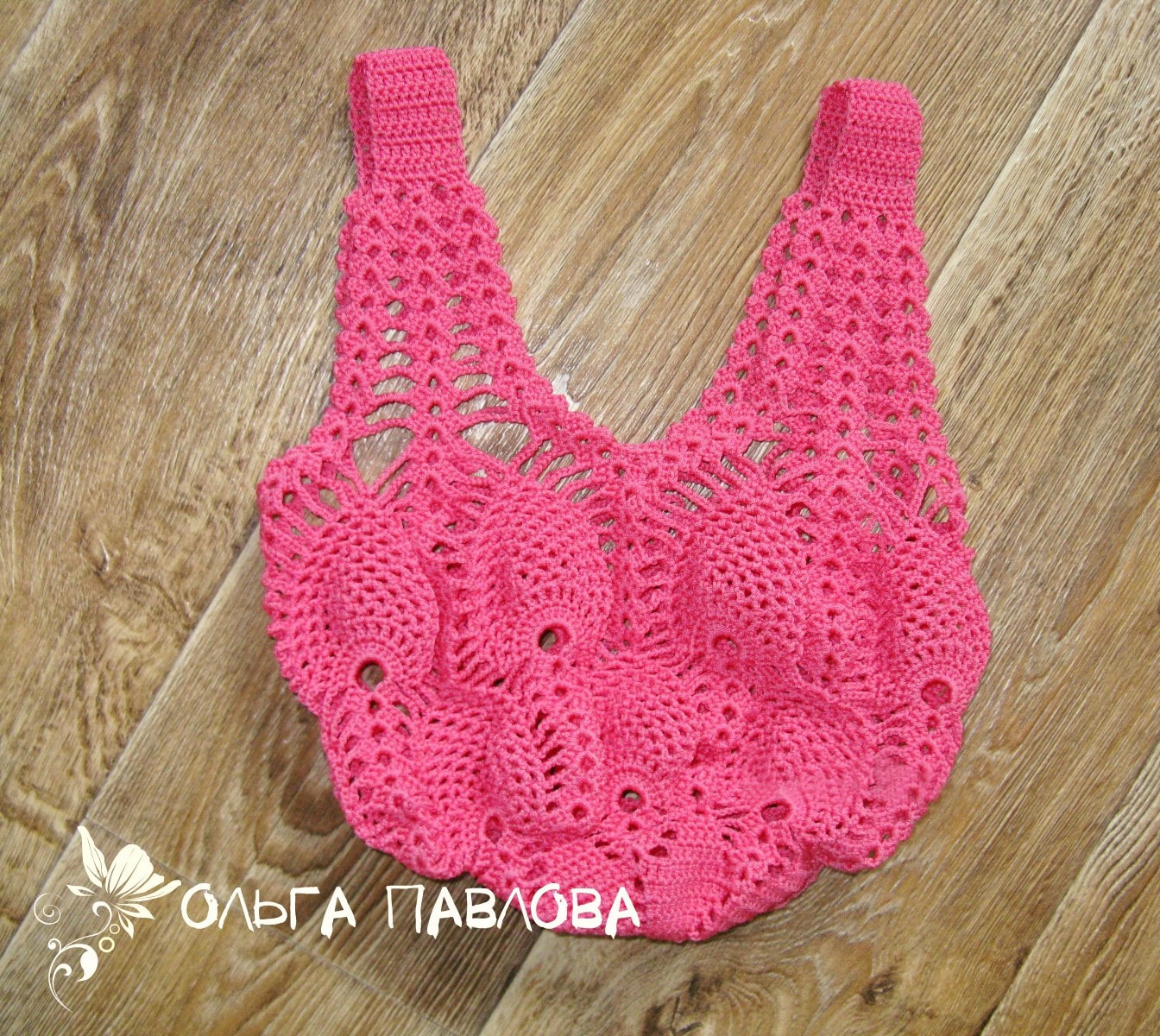 Набрать цепочку воздушных петель и вязать по схеме без отрыва нитиСвязав детали по выкройке, соединить на плечах, края обвязать каймой