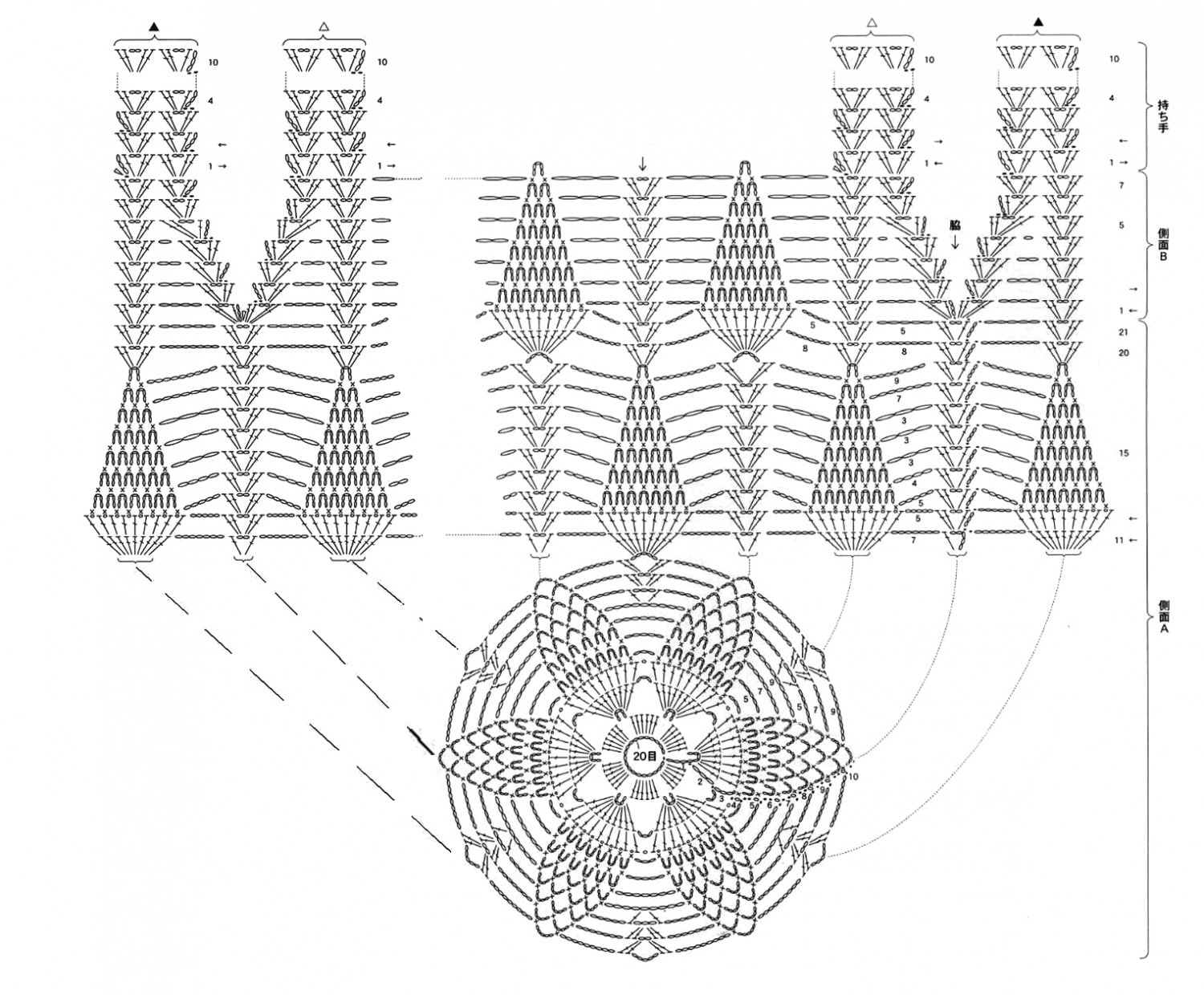 Для изготовления оригинальной модели в японском стиле подойдет летняя смесовая пряжа. Пояснение к схеме: число петель — 8 + 3. Повтор начинается с 4-го ряда, затем 3-й и 4-й.