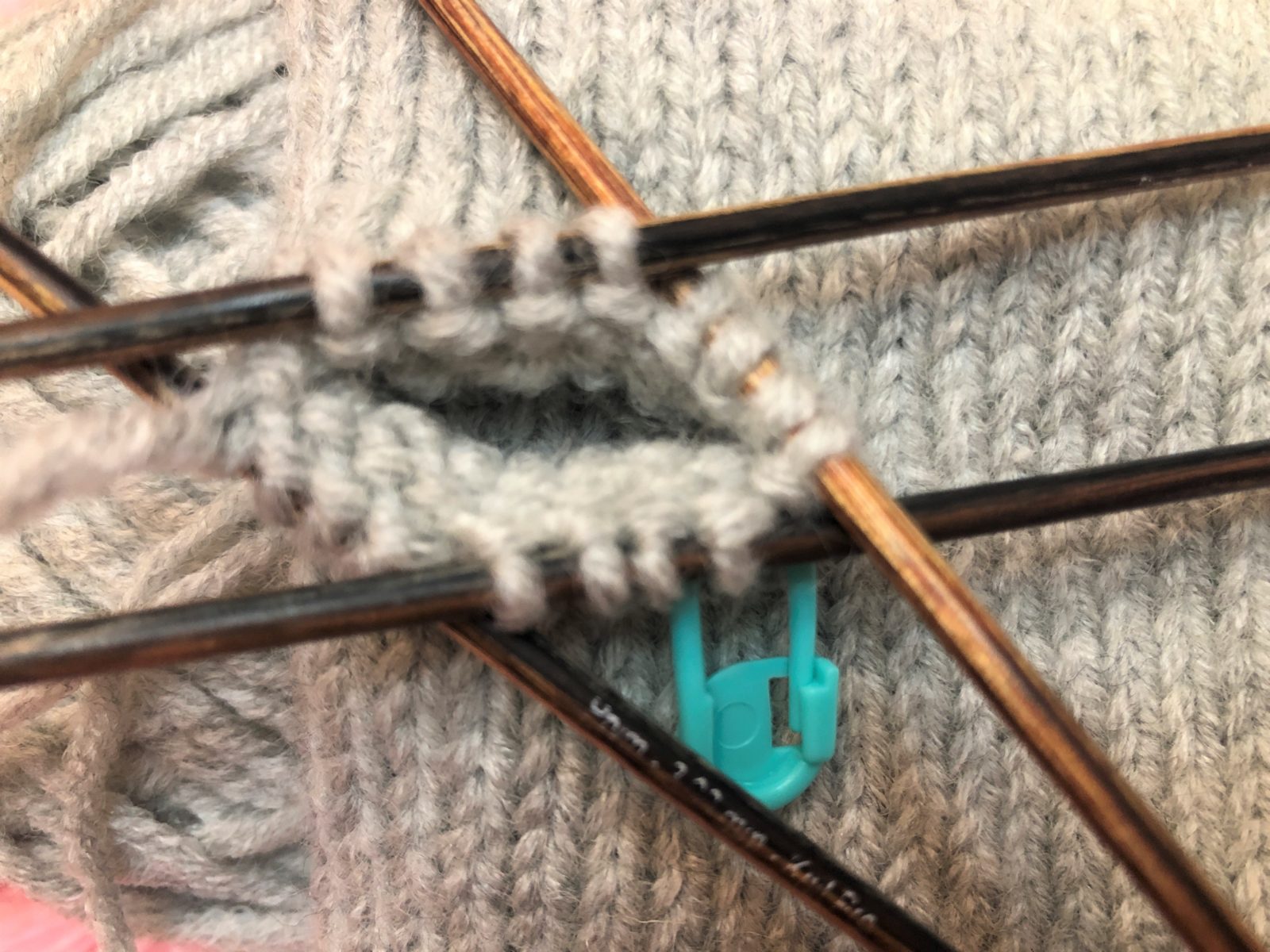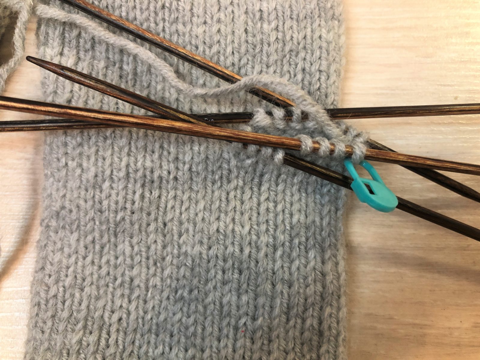 Когда на спицах останется всего 8 петель — стягиваем их иголкой.Для большого пальца переносим снятые на булавку 6 петель на спицу, набираем из краев на три спицы 2+6+2 петли.