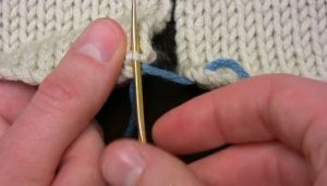 По окончанию вязания детали утюжат, а потом выкладывают на стол. Иглу вдевают рядом с кромочной и первой петелькой, протягивают нитку. На противоположной стороне подхватывают протяжку между петельками. Затем повторяют этапы попеременно и затягивают нитку.