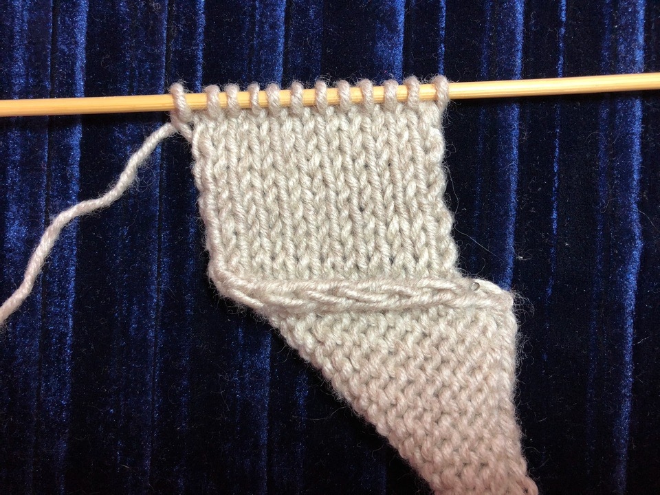 Лицевой ряд: первую петлю снять как лицевую (нить за работой), вторую петлю вязать лицевой скрещенной, предпоследнюю петлю — лицевой скрещенной, последнюю петлю снять не провязывая.