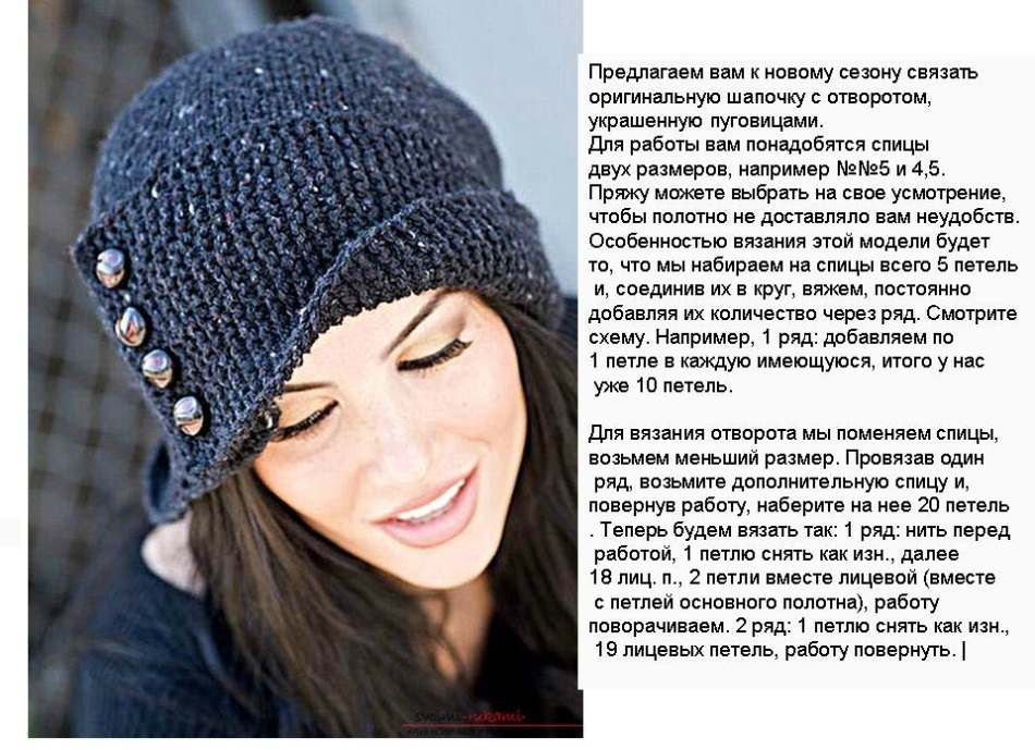Женская шапка спицами платочной вязкой с отворотом: схема, описание