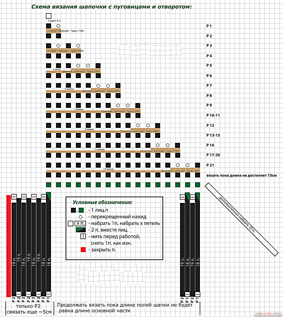 Чтобы связать шапку платочным узором, у которой будет отворот, вы либо: