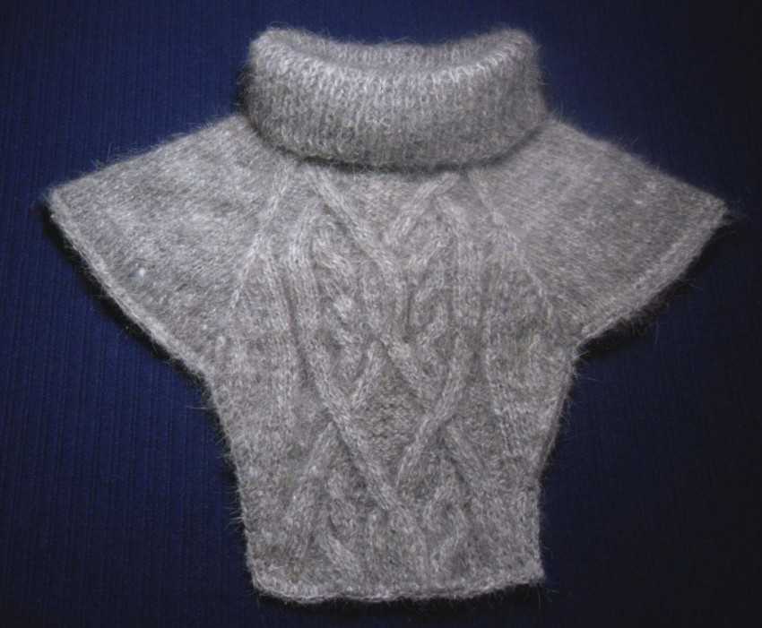 Изделие вяжется сверху вниз на двух прямых спицах с вывязыванием планки. Горловина не складывается пополам, а вяжется на высоту шей.